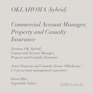 Norman, OK (hybrid)Commercial Account Manager,Property and Casualty InsuranceActive Property and Casualty license (Oklahoma) + 2-4 yrs account mana...