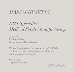 Massachusetts - Direct Hire - EHS Specialist, Medical Foods Manufacturing