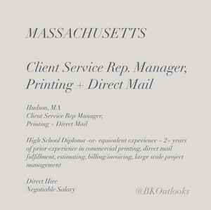 Massachusetts - Direct Hire - Client Service Representative Manager, Commercial Printing + Direct Mail