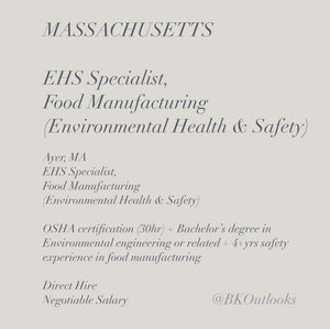 Ayer, MAEHS Specialist, Food Manufacturing(Environmental Health & Safety)OSHA certification (30hr) + Bachelor’s degree in Environmental enginee...